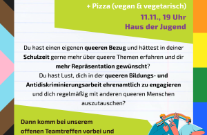 Wir suchen immer Teamer*innen zur ehrenamtlichen Mitarbeit in der queeren Bildungsarbeit bei SCHLAU. Unsere Kontaktdaten findest Du unten!