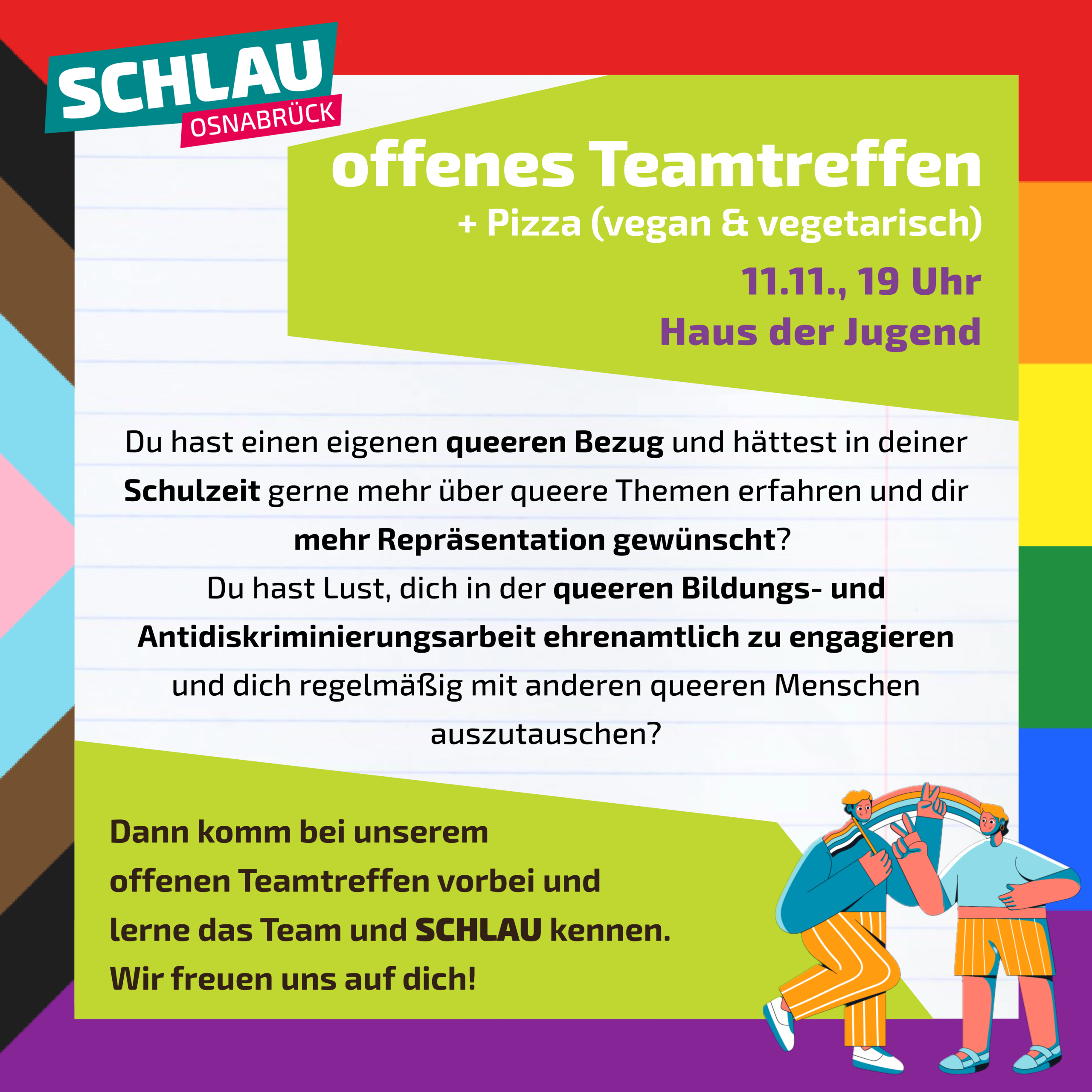 Wir suchen immer Teamer*innen zur ehrenamtlichen Mitarbeit in der queeren Bildungsarbeit bei SCHLAU. Unsere Kontaktdaten findest Du unten!